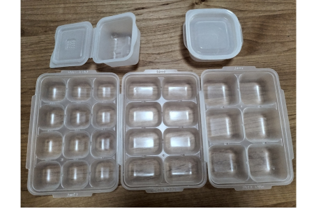 | 実際に使ってみて | ①容量が選べて月齢に合わせやすい。 ②汁ものは取り出しにくいが、おおむね取り出しやすく、蓋付きで衛生的。 ③冷凍庫でも積み重ねやすい。 | ①蓋が外れやすいこともあるが、コスパが良く、気軽に試せる。 ②使わないときは重ねて収納できスペースの省エネになる。 ③そのまま冷凍、レンジ加熱ができるため、時短になる。 ④色移りや変形しやすく、定期的な買い替えが必要。 | ①シンプルで使いやすいが、ダイソーに比べるとコスパが悪い。 ②離乳食専用商品でないため応用が利く。 ③そのまま冷凍、レンジ加熱ができるため、時短になる。 |